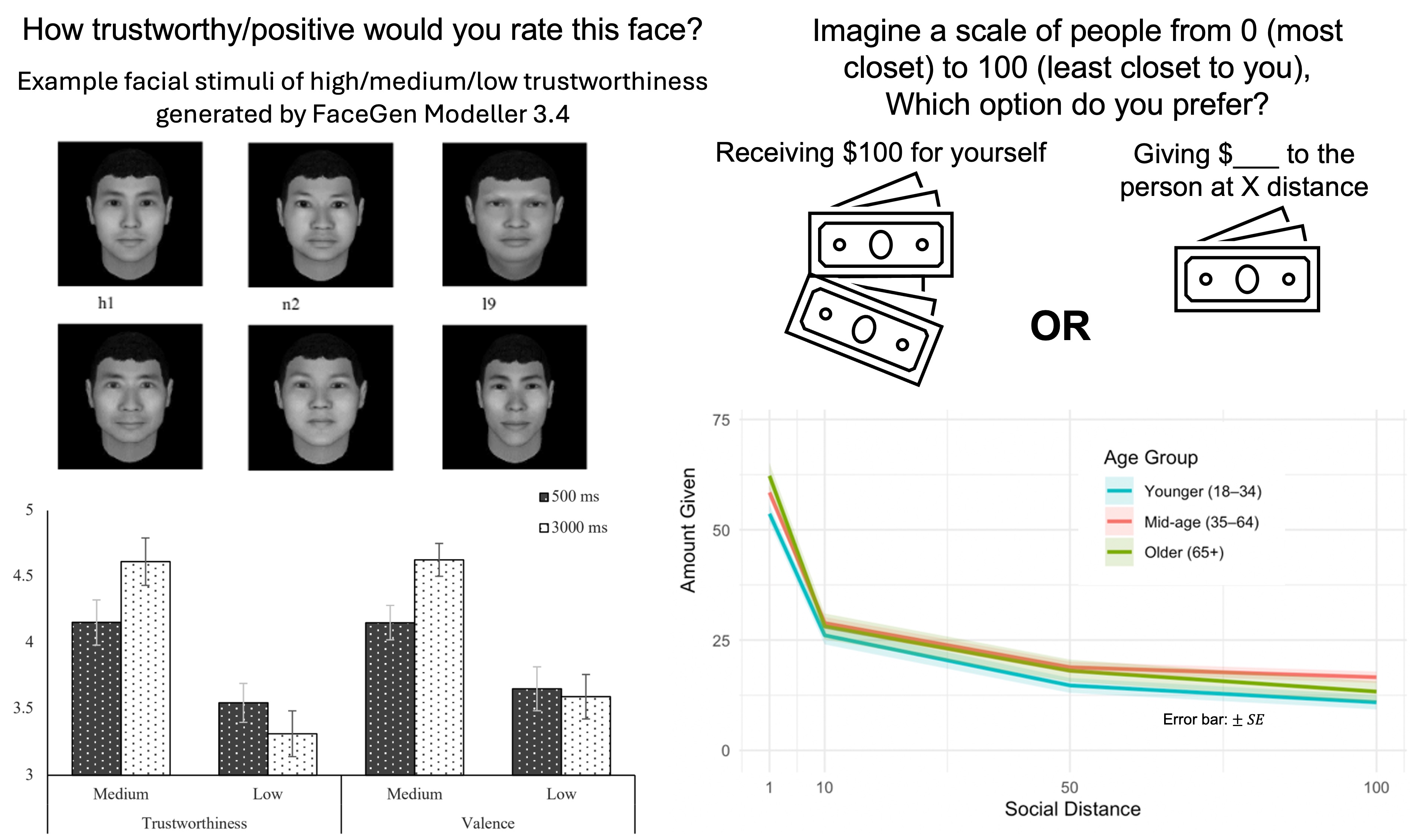 According to the Socioemotional Selectivity Theory (Carstensen, 1992), as people age, they prioritize their social and emotional goals. This shift has important implications for older adults’ judgment and decision-making, particularly given their heightened vulnerability to elder abuse and financial fraud. My ongoing work aims to uncover the age-related differences in judgments and decisions in social contexts.